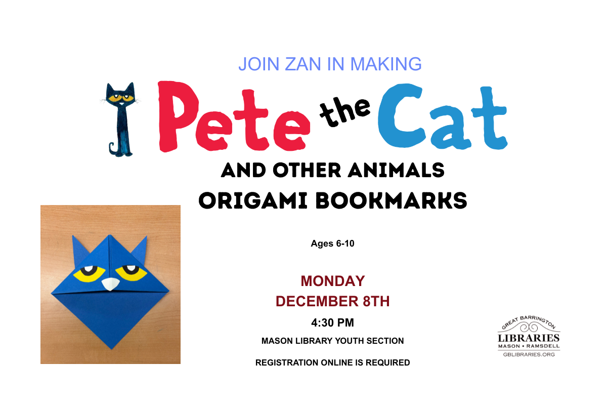 As part of our Pete the cat Week at Mason Library, join Zan as he makes Pete the Cat origami book marks. There will be alternative options for other animal bookmarks, too.
