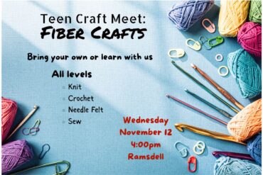 In November we’ll be exploring fiber arts: we’ll have supplies for knitting, crocheting, needle felting and sewing small felt plushies. Join us to craft and chat or to learn a new skill!